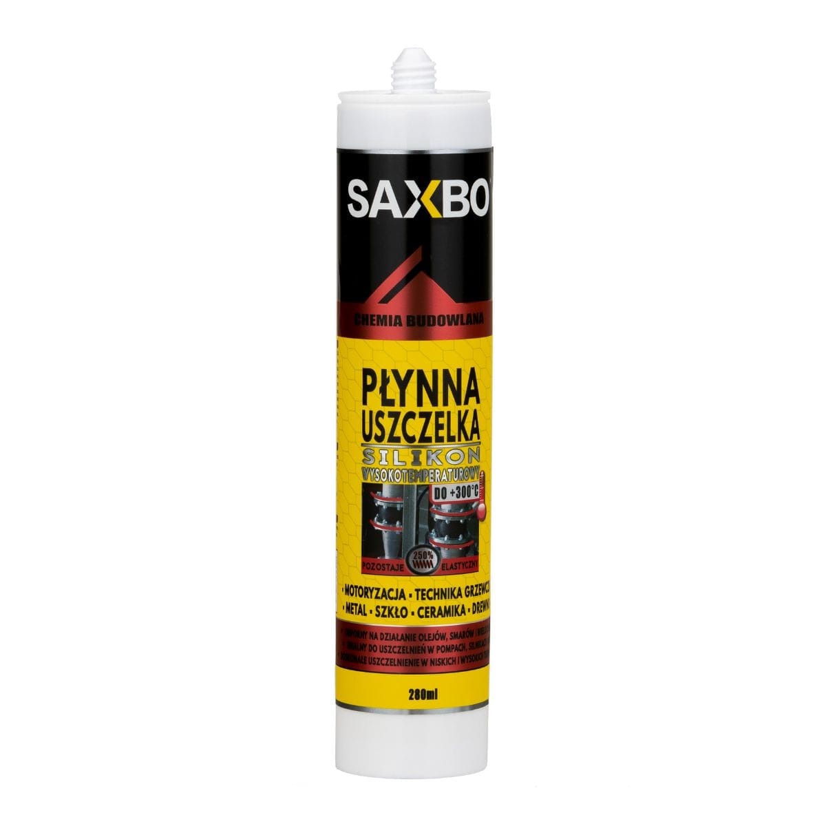 High temperature silicone SAXBO LIQUID GASKET is a specialized sealant that provides a permanent and flexible connection in place, where there are low or high material temperatures. It is resistant to fuels, oils, fats as well many other chemicals. Sealant after curing it is resistant to weather conditions and radiation UV. It is characterized by excellent adhesion to many building materials such as glass, ceramics, wood and metal. Do not use in conjunction with materials sensitive, such as: copper, brass, lead, mirrors, etc.
